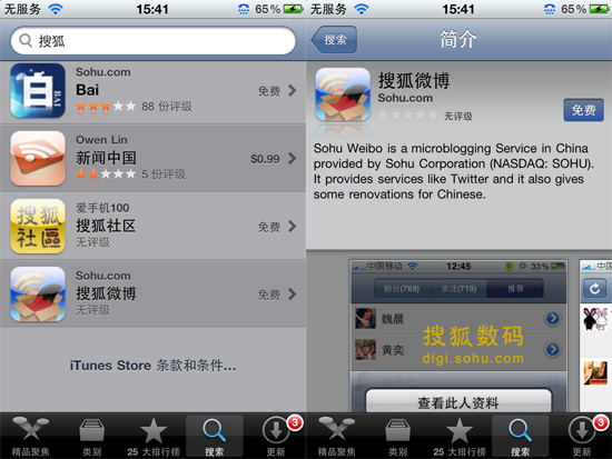 在蘋果App Store中搜索“搜狐”,即可找到搜狐微博客戶端軟件
