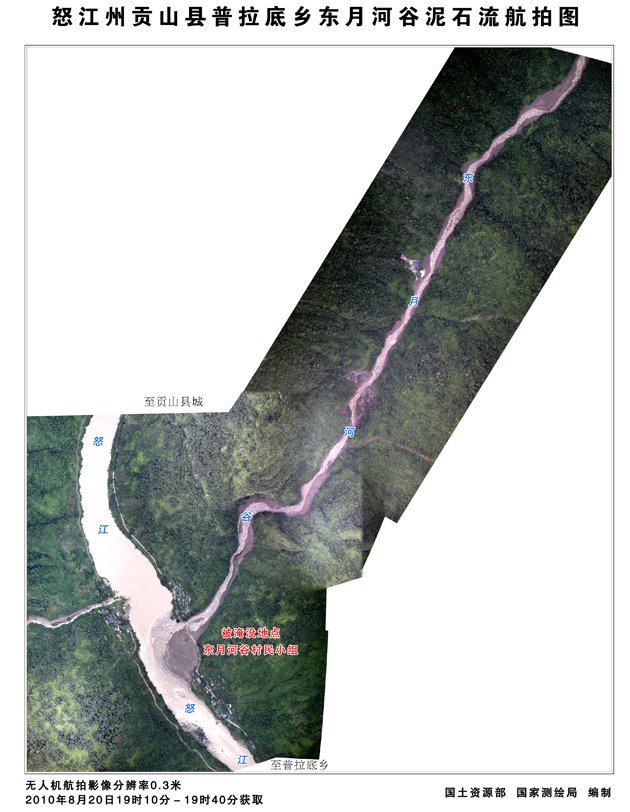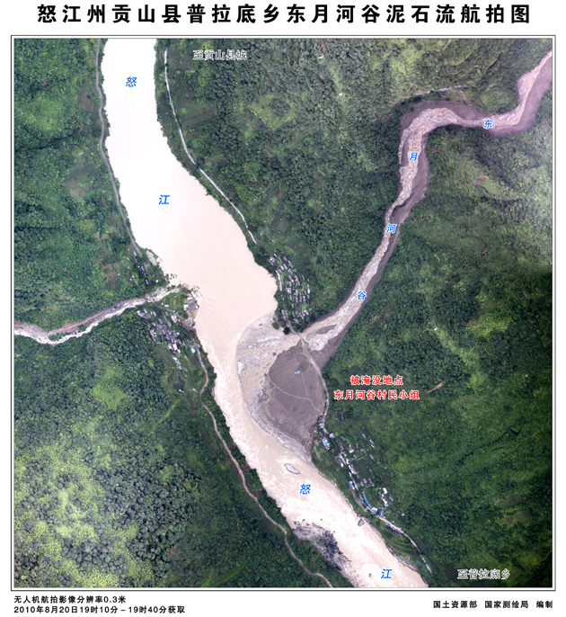 2010年8月18日1點(diǎn)左右,云南怒江傈僳族自治州貢山獨(dú)龍族怒族自治縣普拉底鄉(xiāng)突發(fā)特大泥石流災(zāi)害。地點(diǎn)在普拉底鄉(xiāng)一鐵礦附近,由于連日頻降暴雨,致使該區(qū)域發(fā)生泥石流災(zāi)害。下圖是國家測繪局于8月20日利用無人機(jī)獲取的當(dāng)?shù)刈钚碌臑?zāi)后航拍高清圖。