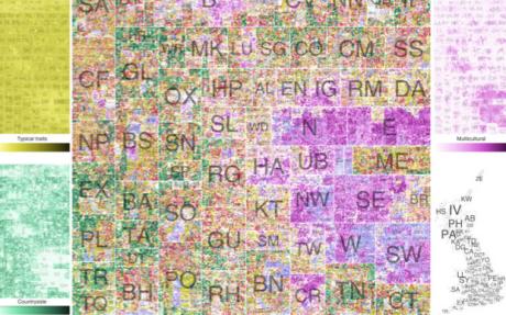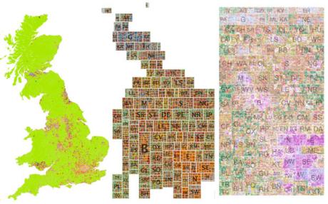 不像傳統(tǒng)的地圖專門強(qiáng)調(diào)地理位置或信息,這幅地圖強(qiáng)調(diào)的是不同類型的居民以及他們?cè)趪?guó)家不同的聚集地。地圖上每組像元值代表的是郵政編碼,而顏色表示的是根據(jù)人口普查數(shù)據(jù)得到的經(jīng)濟(jì)衡量值。