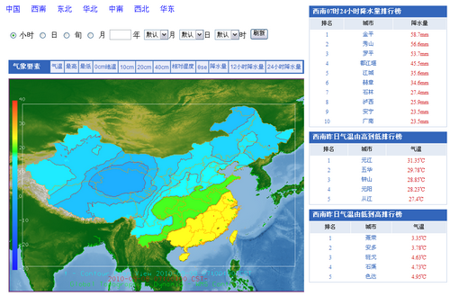 四川省氣象局開發(fā)的web GIS多時間尺度的地面氣象要素服務系統(tǒng),已正式用于中國天氣網四川站GIS服務。本系統(tǒng)以全國氣象自動地面站小時氣象要素實況為基礎,按照多時間尺度的方法進行加工處理,使公眾能夠在中國天氣網上通過交互方式獲取到各種地面氣象圖形服務產品。