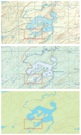 上面兩幅圖像是分別來自1956年和1976年的紙質(zhì)地圖。最下面那幅圖像顯示了地質(zhì)時(shí)期的地理空間層;依據(jù)元數(shù)據(jù)判斷,這些數(shù)據(jù)應(yīng)來自1974至2000年間。試問,在沒有數(shù)據(jù)保存的前提下,加拿大環(huán)境現(xiàn)象的研究又怎么能成為可能呢?