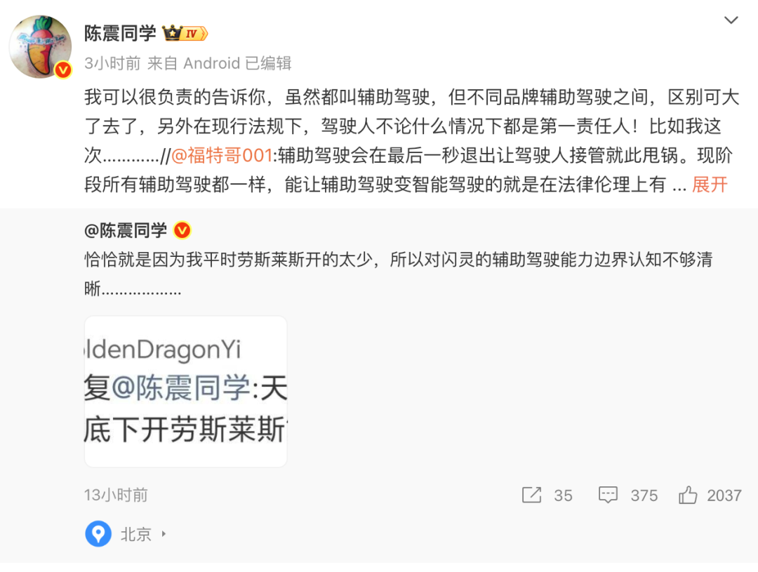 10月14日,陳震再發(fā)文:“雖然都叫輔助駕駛,但不同品牌輔助駕駛之間,區(qū)別可大了去了,另外在現(xiàn)行法規(guī)下,駕駛人不論什么情況下都是第一責任人!比如我這次……”此前有網(wǎng)友評論表示,輔助駕駛會在最后一秒退出讓駕駛人接管就此甩鍋?,F(xiàn)階段所有輔助駕駛都一樣,能讓輔助駕駛變智能駕駛的就是在法律倫理上有說法,否則廠商一定會把責任推給駕駛人,看什么數(shù)據(jù)都沒有用。別吹輔助駕駛了真的,什么時候開智能駕駛出事廠商全責再出來吹吧,不管中外哪家企業(yè)都是這個道理。”