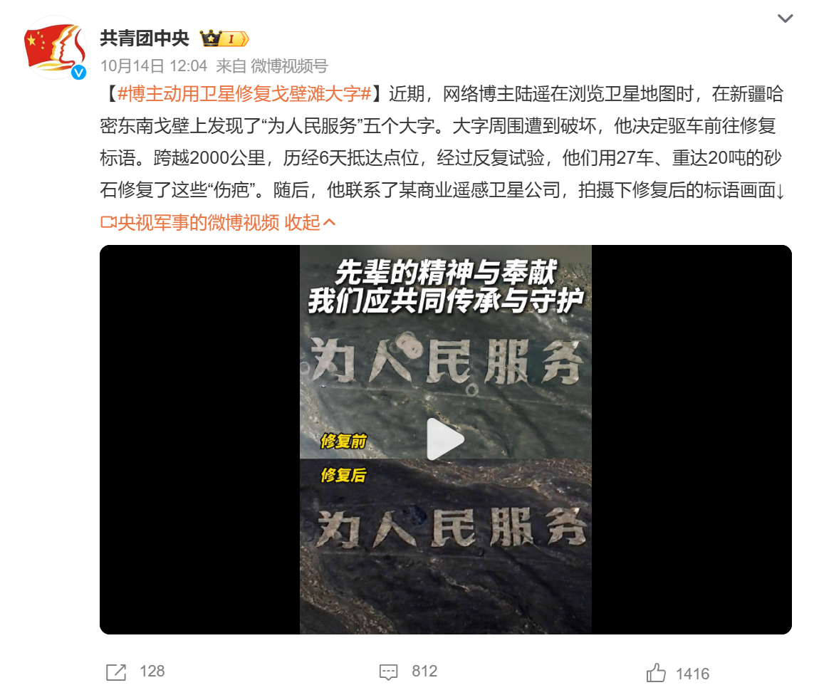 據(jù)共青團中央、央視新聞消息,不久前,自媒體博主陸遙在瀏覽衛(wèi)星地圖時發(fā)現(xiàn),在新疆哈密東南戈壁上“為人民服務(wù)”五個大字周圍遭到破壞,因此決定驅(qū)車前往查看,最終用27車、重達20噸的砂石修復了這些“傷疤”。