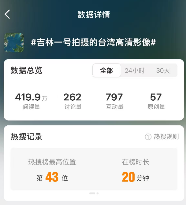 隨后,#吉林一號拍攝的臺(tái)灣高清影像#等話題登上微博熱搜榜單。