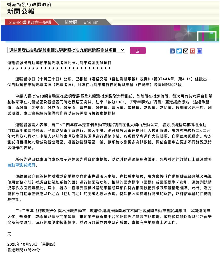 香港施政報告2025明確支持自動駕駛,蘿卜快跑率先在九龍跨區(qū)測試