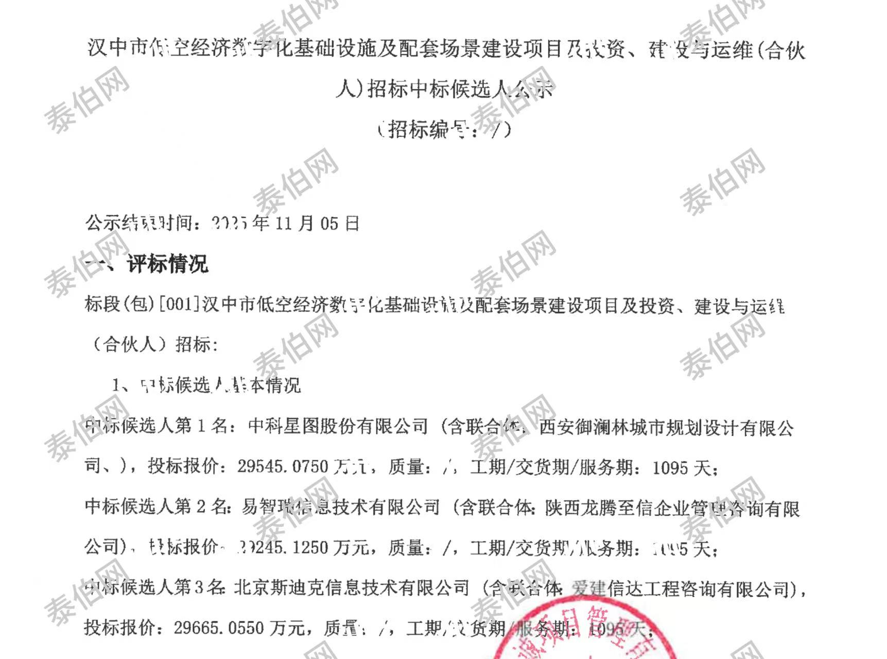 泰伯網(wǎng)訊,11月3日,陜西采購與招標網(wǎng)公示“漢中市低空經(jīng)濟數(shù)字化基礎(chǔ)設(shè)施及配套場景建設(shè)項目及投資、建設(shè)與運維(合伙人)”項目中標候選人,中標候選人第一名為中科星圖股份有限公司(以下簡稱:“中科星圖”),投標報價約2.95億元。